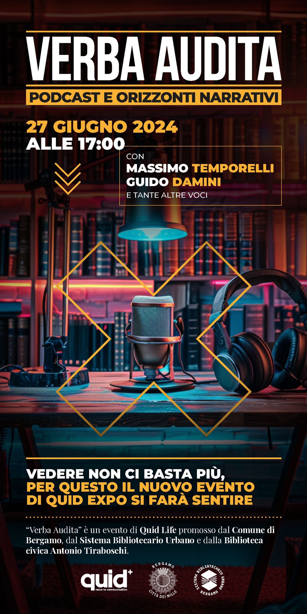 L’iniziativa di Quid Life, in collaborazione con il Comune di Bergamo e il Sistema Bibliotecario Urbano, è aperta a tutti e si pone l’obiettivo di presentare al pubblico i diversi orizzonti narrativi offerti dal podcast: attraverso voci affermate del mondo del podcasting sarà svelato un nuovo modo di fare divulgazione, capace di toccare corde emozionali e sfruttare uno storytelling coinvolgente, appassionate ed empatico.