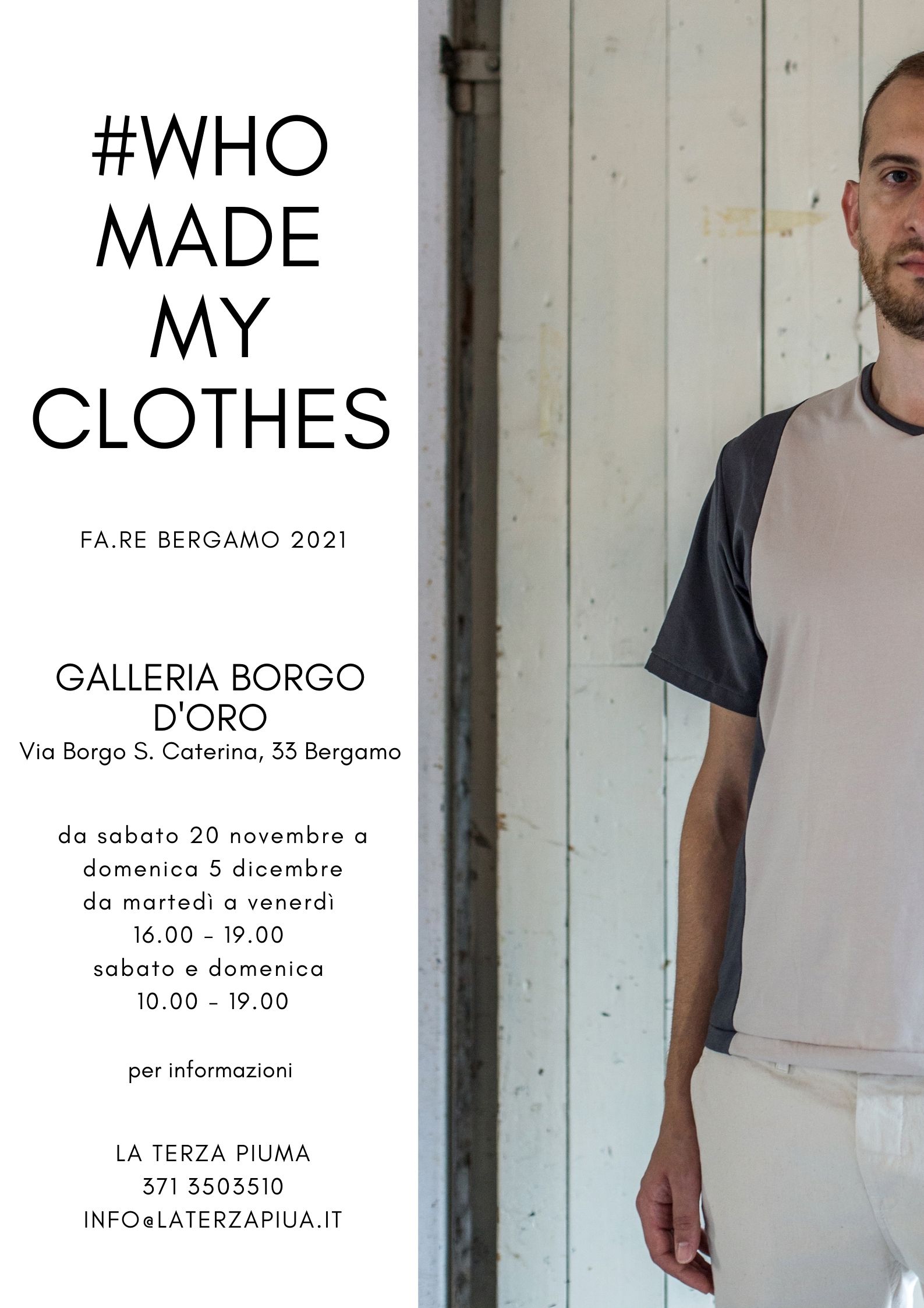 Sabato 20 Novembre 2021 alle 11.30 La Terza Piuma inaugura il progetto collettivo #whomademyclothes presso la Galleria Borgo d’oro in Via Borgo S. Caterina, 33 Bergamo.