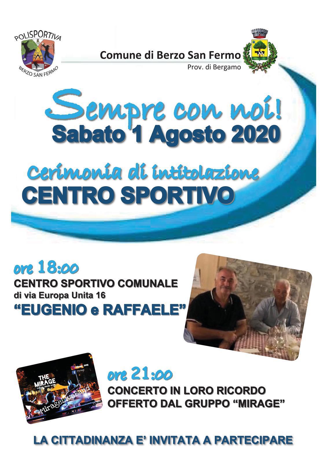 Sabato 1 agosto, il Comune e la Polispostiva di Berzo San Fermo organizzano la cerimonia di intitolazione del Centro Sportivo del paese, in ricordo dei due volontari, Eugenio e Raffaele, che sono venuti a mancare a causa del Covid-19.