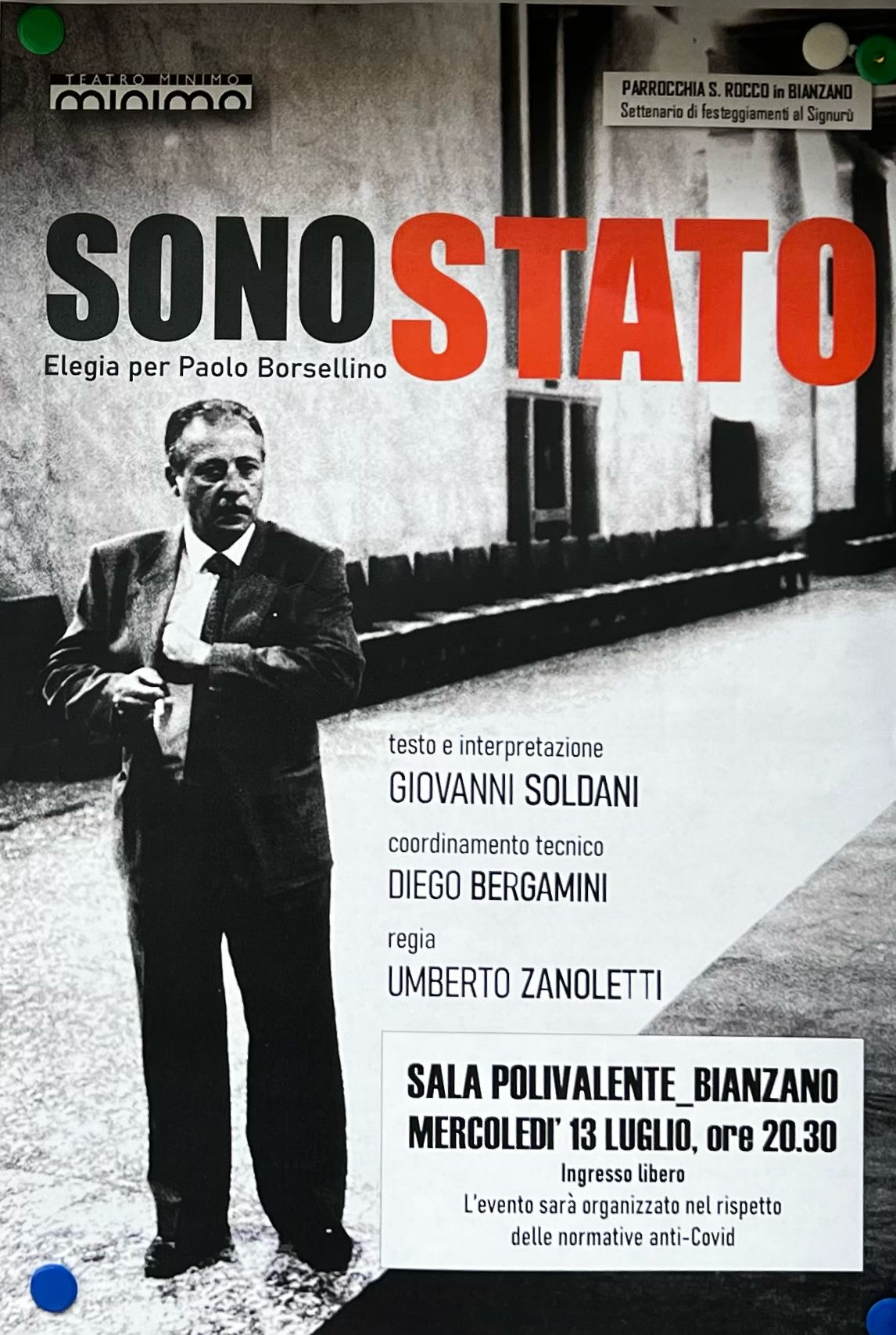Sono Stato vuole essere un omaggio a entrambi, nonostante questa pièce si concentri sulla figura di Borsellino. A lui è toccato incontrare la morte due volte: il 23 maggio nel momento in cui ha tenuto nelle sue braccia fino all’ultimo respiro l’amico Giovanni, e il 19 luglio quando l’ultimo respiro lo ha esalato lui.