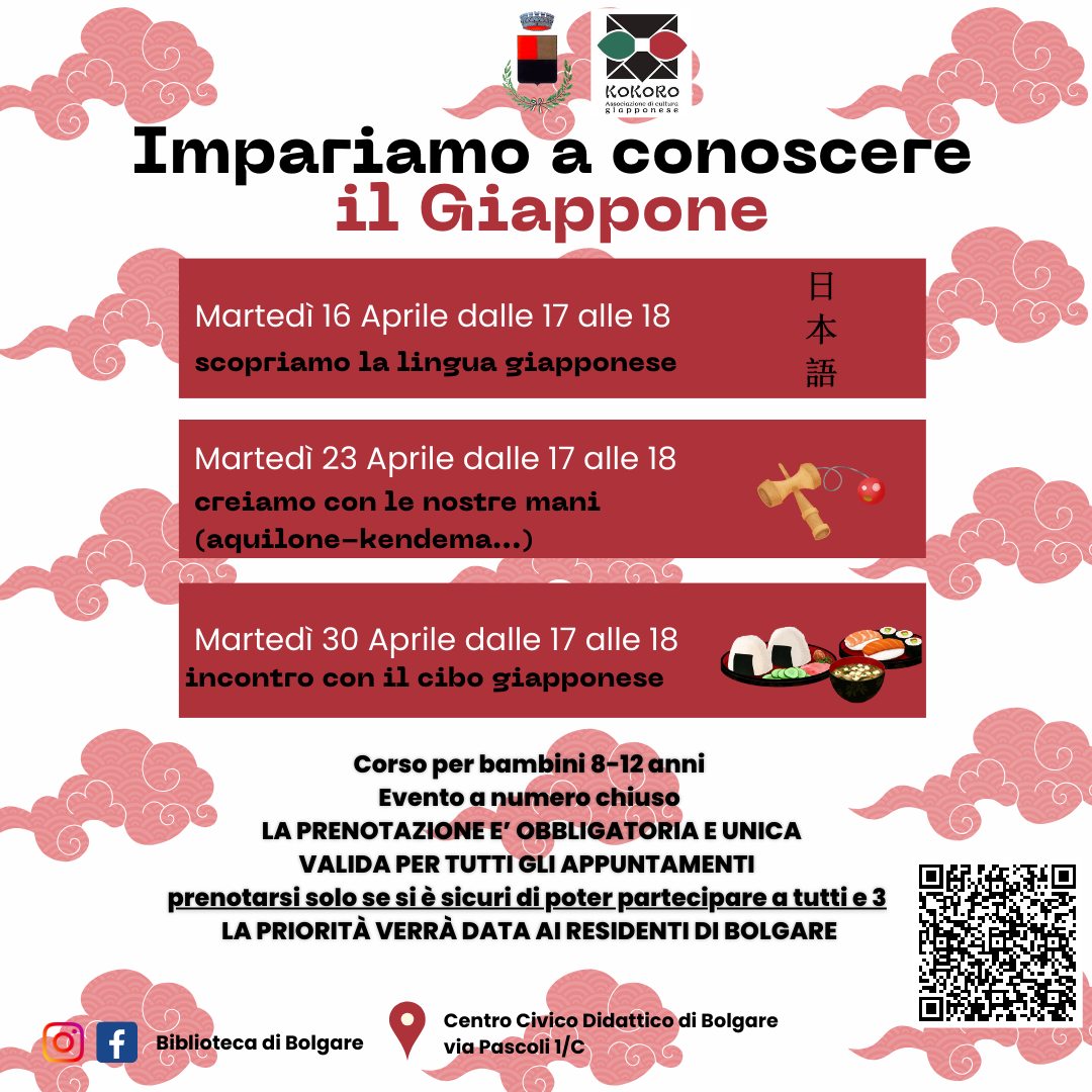 La biblioteca del comune di Bolgare invita ad immergersi nella cultura giapponese, proponendo tre incontri, in collaborazione con l’Associazione culturale Giapponese KOKORO, rivolti ai bambini dagli 8 ai 12 anni.