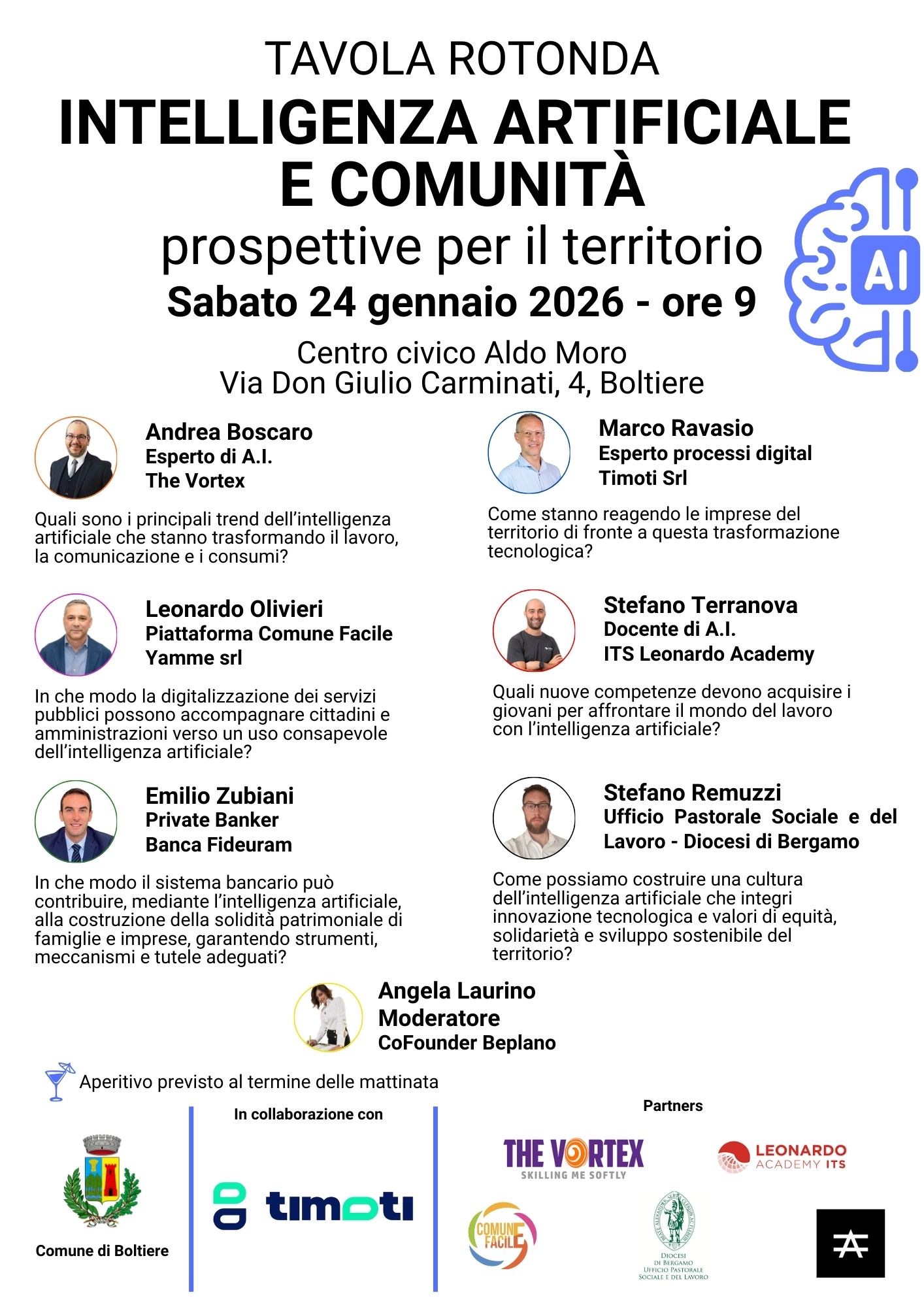Sabato 24 gennaio alle 9.00 Centro civico Aldo Moro, Via Don Giulio Carminati 4, Boltiere, Esperti provenienti dal mondo dell’innovazione, dell’impresa, della formazione, dei servizi pubblici, del sistema bancario e del sociale dialogheranno su come l’intelligenza artificiale stia trasformando lavoro, servizi, economia e comunità locali, con uno sguardo attento a equità, sostenibilità e sviluppo del territorio.