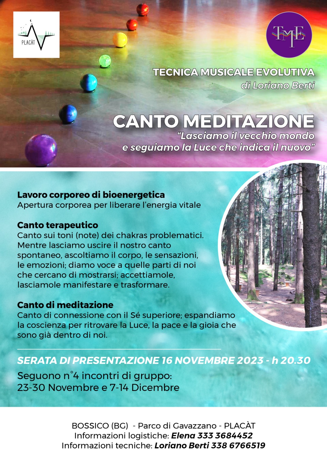 Cinque incontri, di cui il primo di prova, con il Musicista e Terapeuta Loriano Berti. Gli incontri inizieranno con un lavoro corporeo di bioenergetica per proseguire con un canto terapeutico e di meditazione.