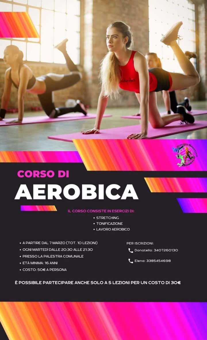 Ogni martedรฌ a Bossico si tiene il corso di aerobica, che consiste in esercizi di stretching, tonificazione e lavoro aerobico.