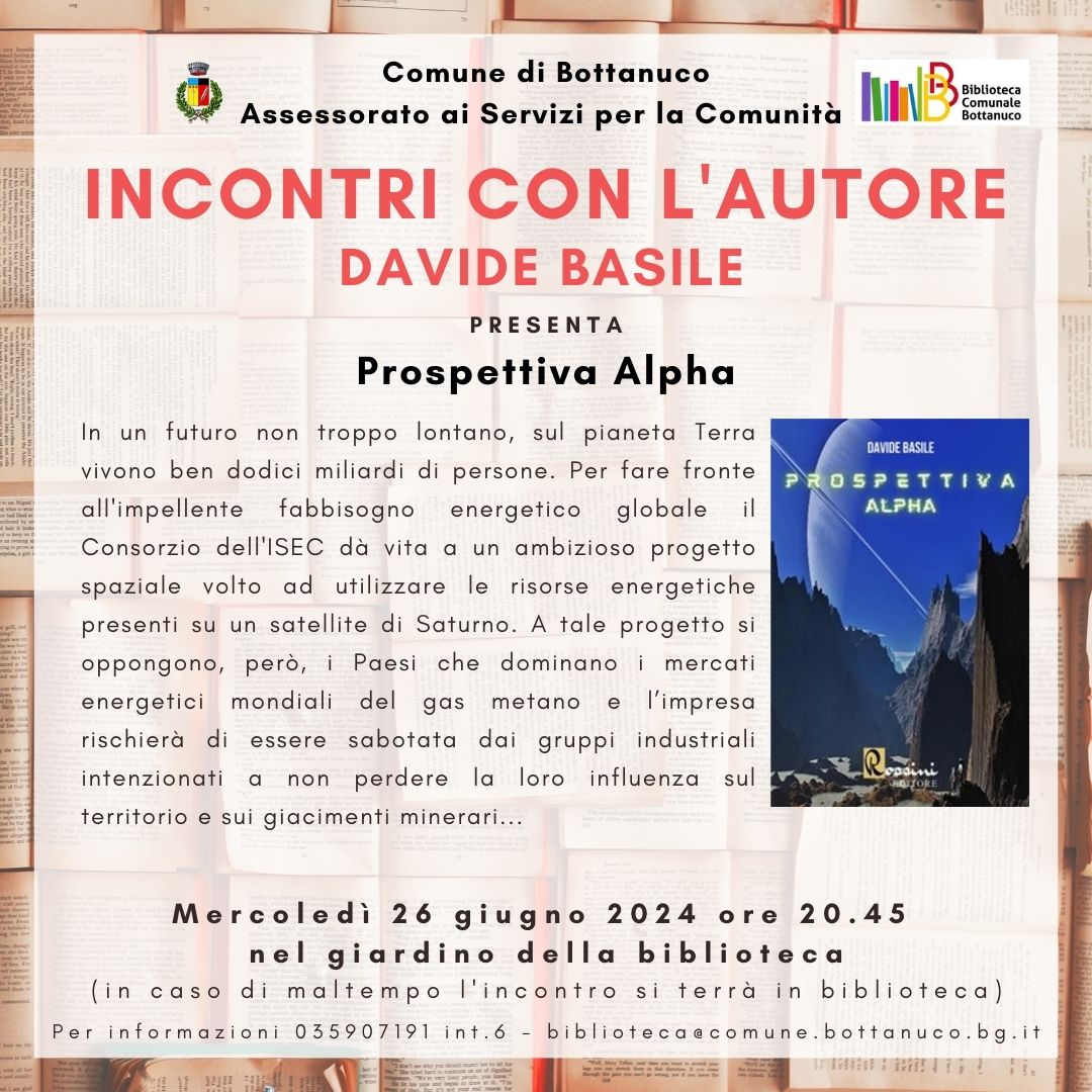 Prosegue la rassegna estiva "incontri con l'autore". In questa serata Davide Basile presenterà "Prospettiva Alpha". In un futuro prossimo sul pianeta Terra, dodici miliardi di persone affronteranno una crisi energetica globale. Chi si salverà?