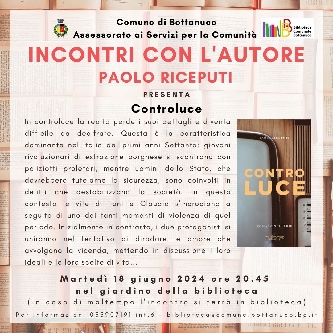 Torna in biblioteca la rassegna estiva "incontri con l'autore". Oggi Paolo Riceputi presenta "Controluce," un romanzo ambientato nei primi anni Settanta, che vede come protagonisti Toni e Claudia, due ragazzi che rimetteranno in discussione scelte e ideali
