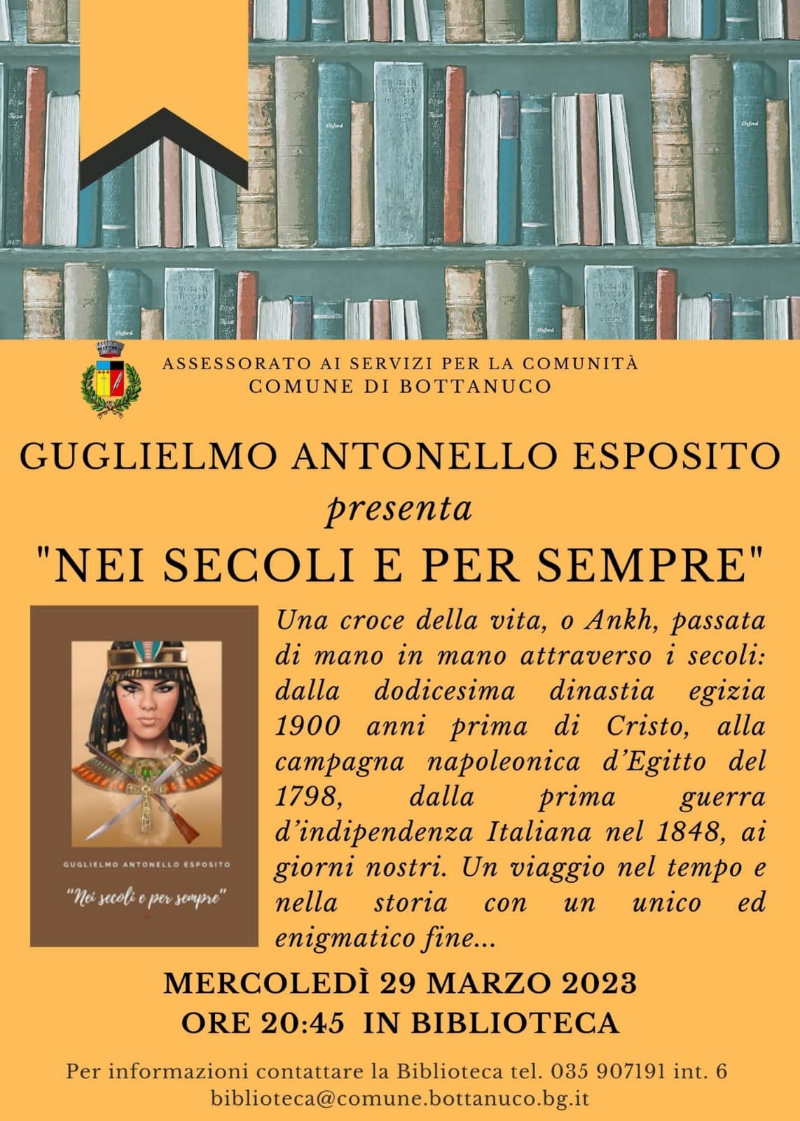 Questa sera sarà presente l'autore Bergamasco Guglielmo esposito, per presentare il suo nuovo libro. L'iniziativa è stata promossa dall'assessorato ai servizi per la comunità del comune di Bottanuco.