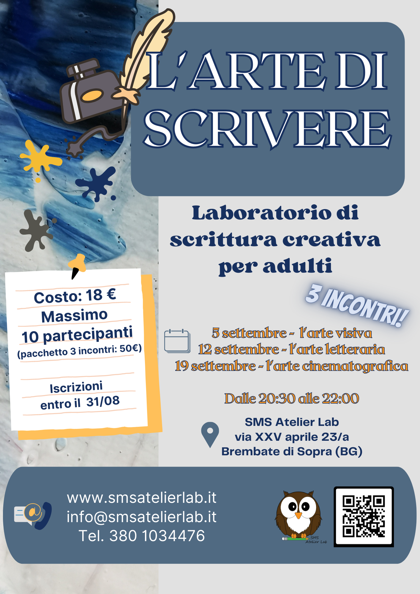 A settembre SMS Atelier Lab dedica alcune serate all'arte di scrivere. Tre appuntamente di scrittura creativa per adulti in cui ipartecipanti stenderanno il proprio racconto trovando ispirazione dall'arte visiva, cinematografica e dalla letteratura contemporanea. Tre forme d'arte differenti che forniscono numerosi spunti per lasciar poi libero spazio alla propria immaginazione.