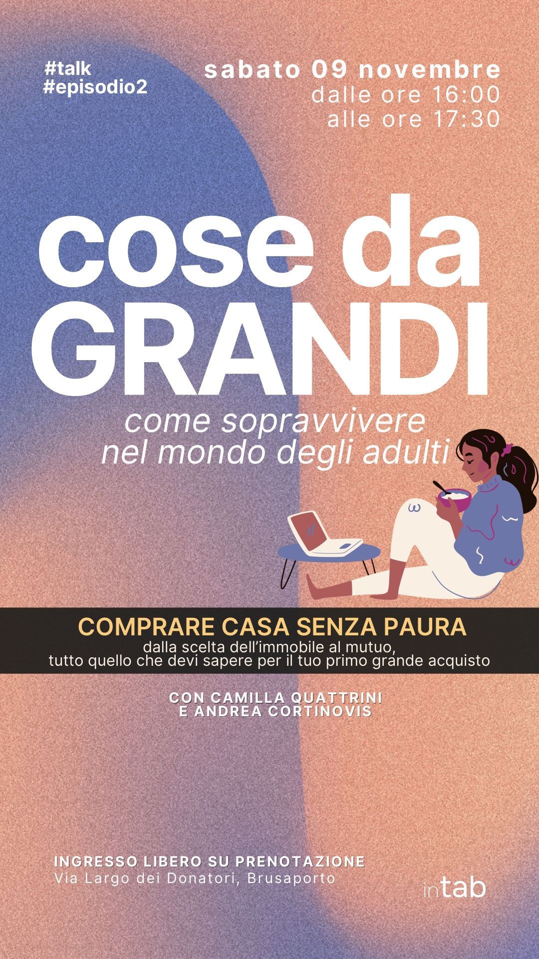 "Cose da Grandi" è un ciclo di incontri tenuto da giovani per giovani, per imparare a muoversi con destrezza nel mondo degli adulti: appuntamento con focus sul mutuo e sull'acquisto casa. Con Camilla Quattrini e Andrea Cortinovis, agenti immobiliari.