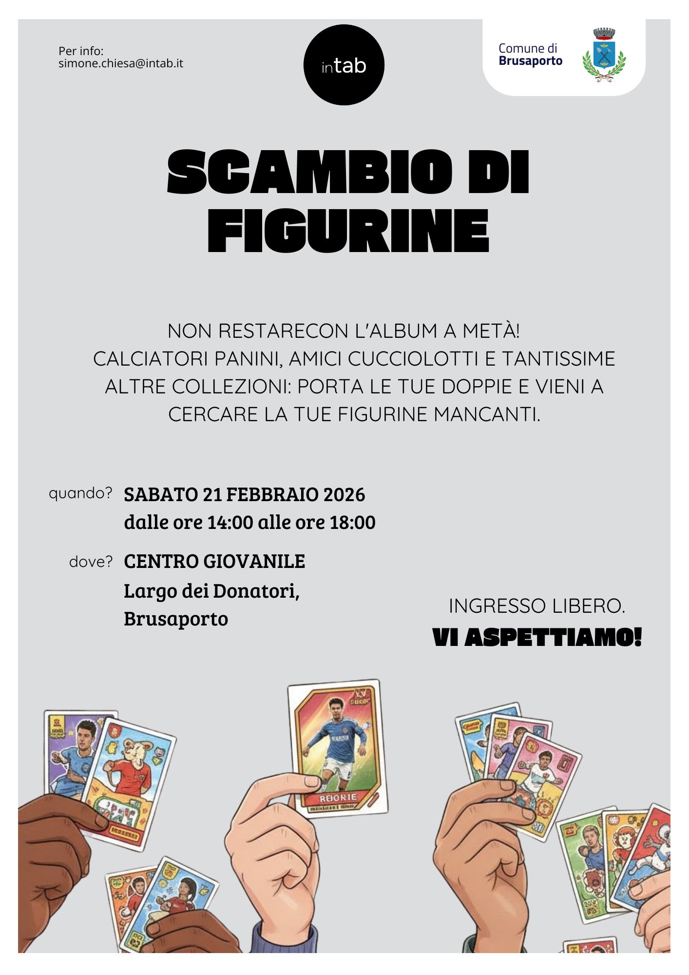 Sabato 21 febbraio presso il il TAB - Centro Giovani di Largo Donatori a Brusaporto si svolgerร lโevento โCe lโho, mi mancaโ, dedicato allo scambio di qualsiasi tipo di figurine: calciatori Panini, Amici Cucciolotti e altre figurine!