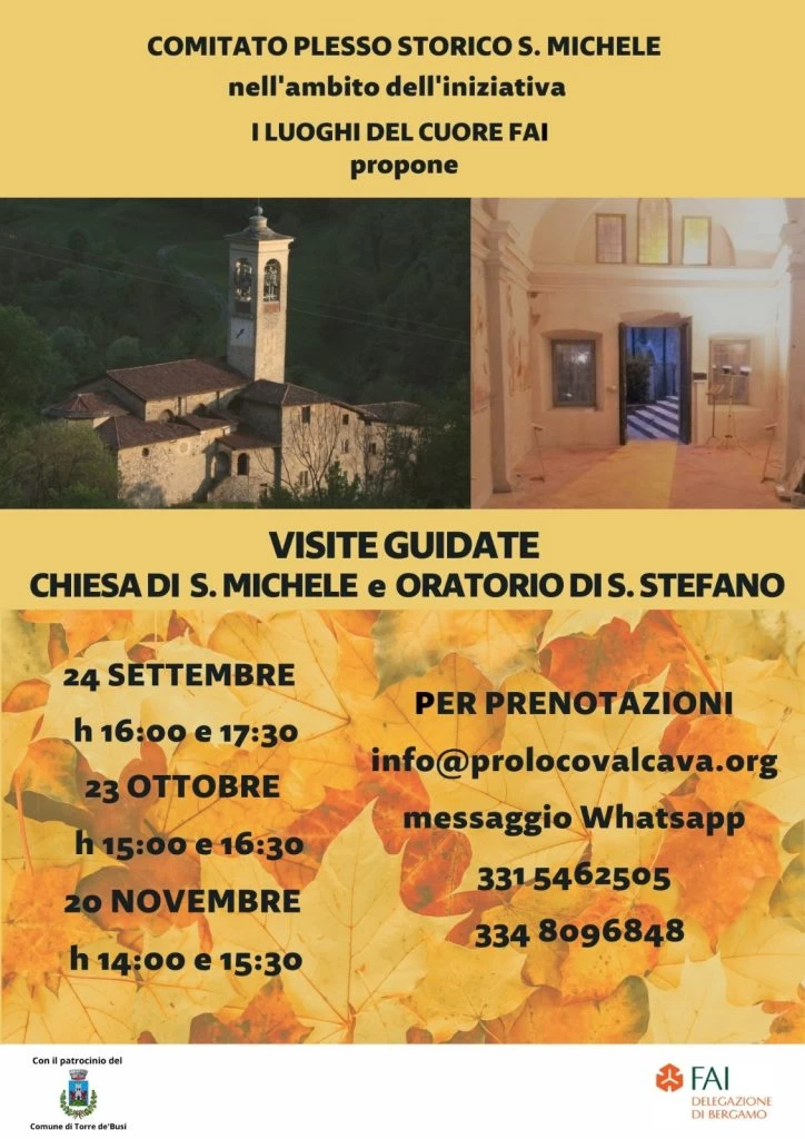 Il Comitato per la valorizzazione del Complesso storico di San Michele, costituitosi in occasione dell'inserimento di questo bene nei Luoghi del Cuore del FAI per il 2022, propone delle visite guidate anche per questo autunno alla riscoperta del Complesso storico di San Michele, oggi purtroppo abbandonato. Questo bene, edificato su uno sperone roccioso, affonda le sue radici nel XII secolo e racchiude una storia ricca di fascino e di fede. Per la prima volta dopo molti anni saranno riaperte le porte dell'antica Chiesa di San Michele, un tempo Chiesa matrice del territorio comunale su cui sorge e dei territori limitrofi. Oggi abbiamo l'occasione di valorizzare questo patrimonio facendolo conoscere, certi che la conoscenza sia il primo passo per la sua conservazione.