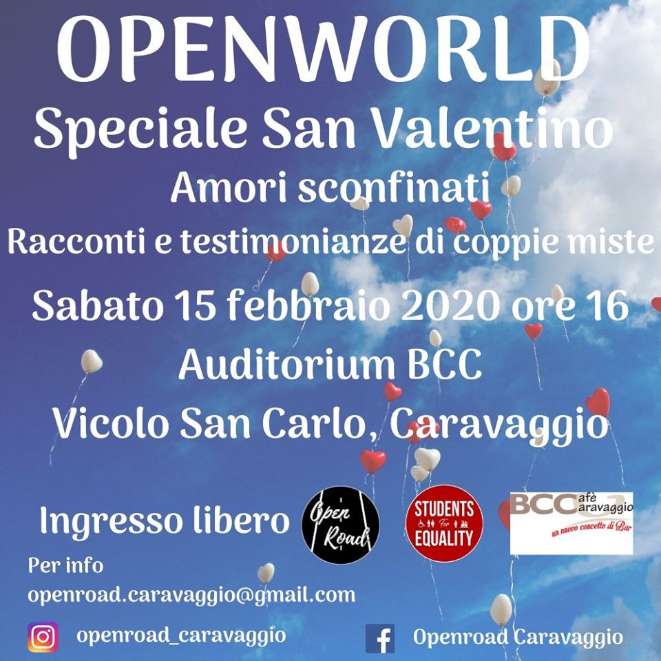 Presso l'Auditorium BCC di Caravaggio, in Vicolo San Carlo, in occasione di San Valentino, il 15 febbraio 2020 dalle ore 16.00 alle ore 18.00 si svolgerà un incontro pubblico dove si parlerà di e con coppie con partner di diversa nazionalità od origine etnica.