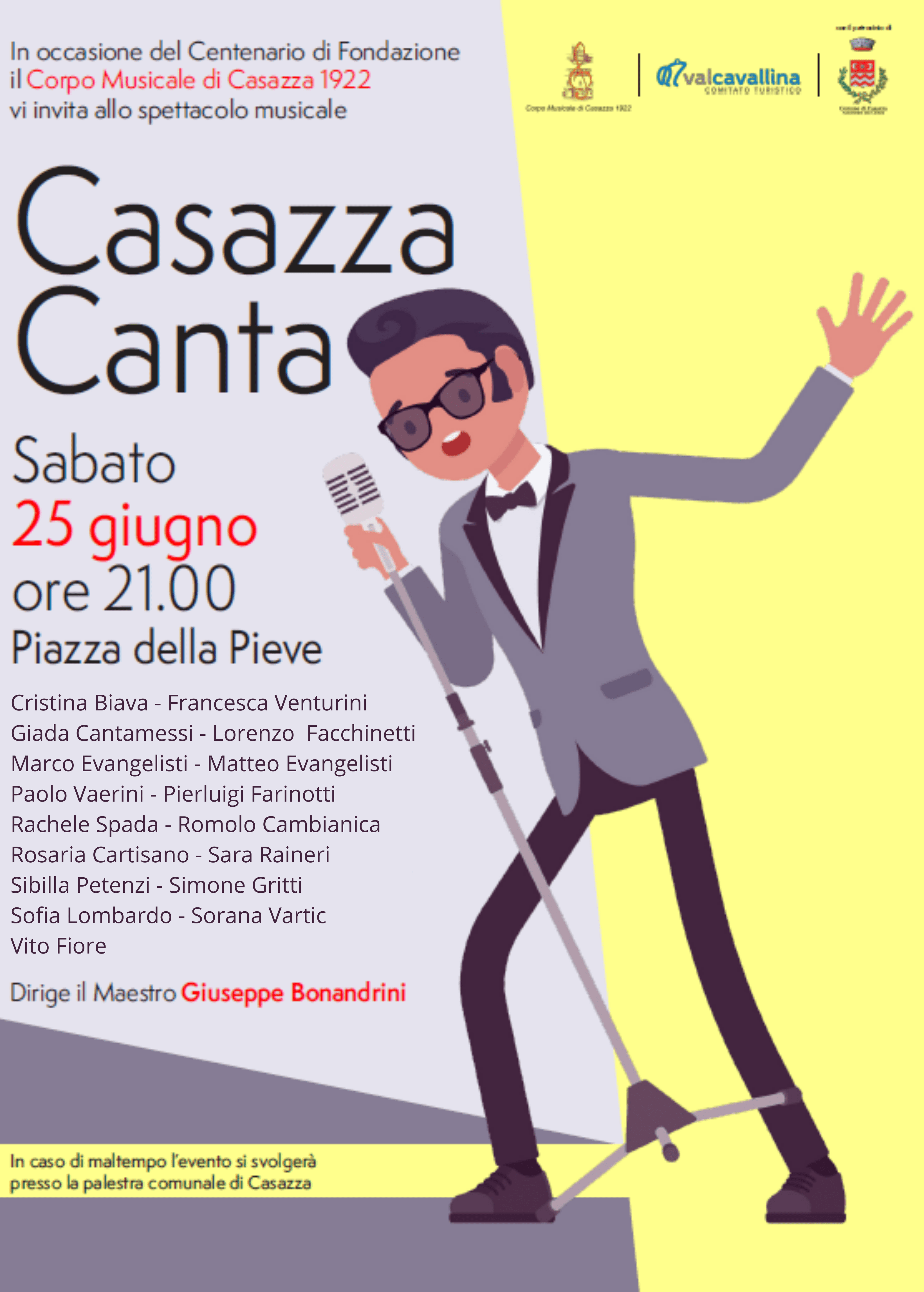 In occasione del Centenario di fondazione il Corpo Musicale di Casazza 1922 invita al concerto "Casazza Canta", che si terrà sabato 25 giugno alle ore 21.00 a Casazza, Piazza Pieve. Il Corpo Musicale proporrà un repertorio di brani che verranno interpretati da cantanti di Casazza e della Val Cavallina.