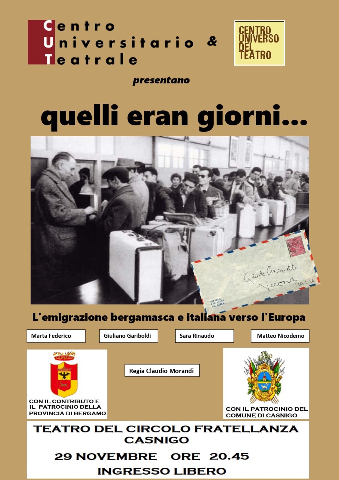 L'emigrazione bergamasca e italiana verso l'Europa, raccontata dal Centro Universitario Teatrale. Molti italiani a inizio anni '60 iniziarono a scrivere lettere, includendo dettagli sulla vita che conducevano nelle terre d'immigrazione.