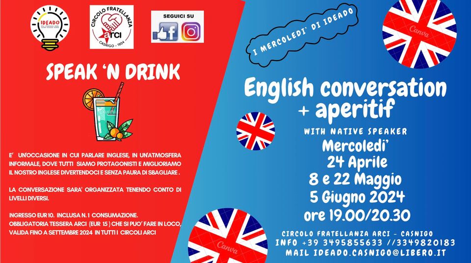English conversation + aperitif with native speaker. Un’occasione in cui parlare inglese, in un’atmosfera informale, dove tutti siamo protagonisti e miglioriamo il nostro inglese divertendoci e senza paura di sbagliare.