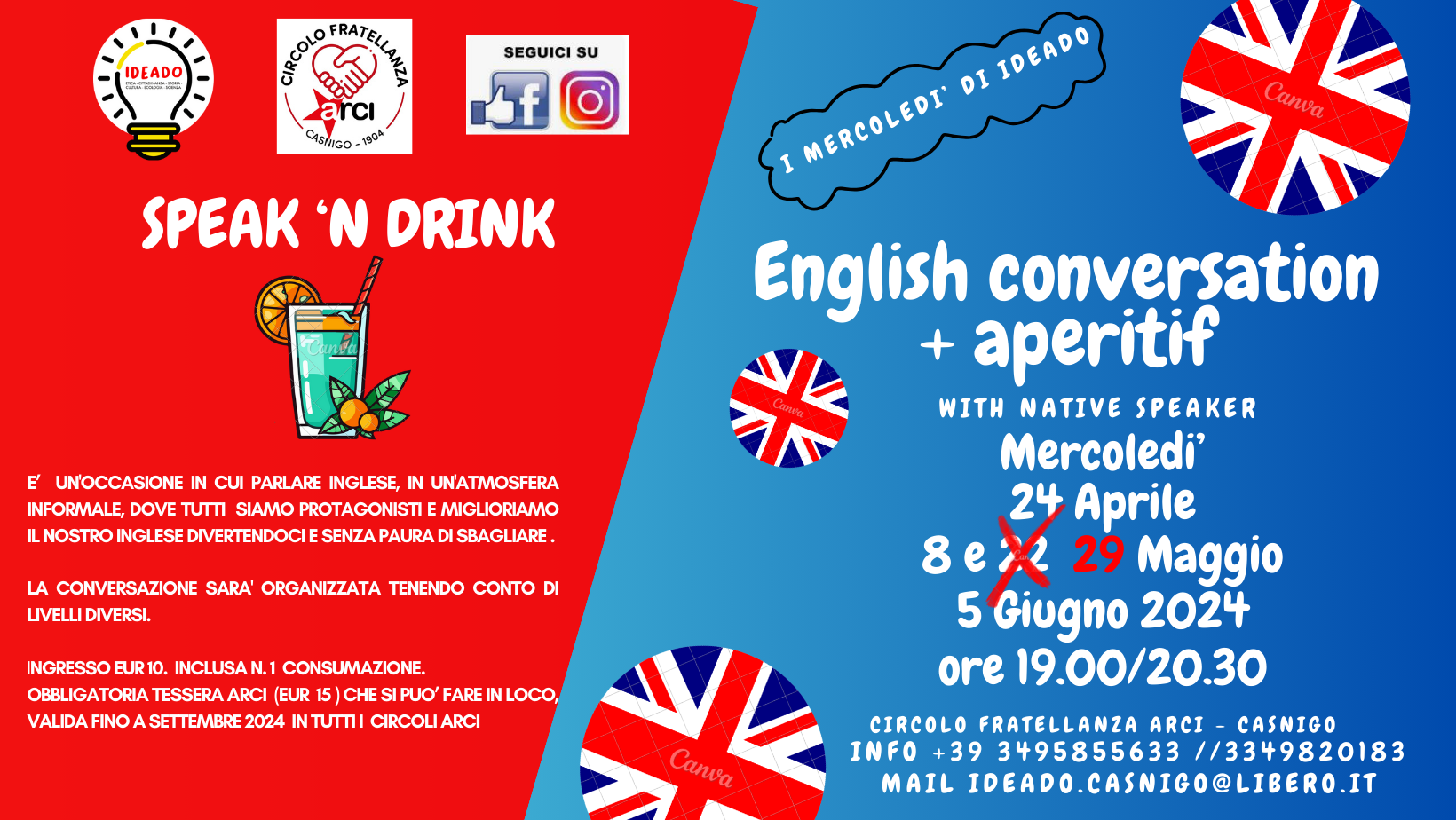 English conversation + aperitif with native speaker. Un’occasione in cui parlare inglese, in un’atmosfera informale, dove tutti siamo protagonisti e miglioriamo il nostro inglese divertendoci e senza paura di sbagliare.