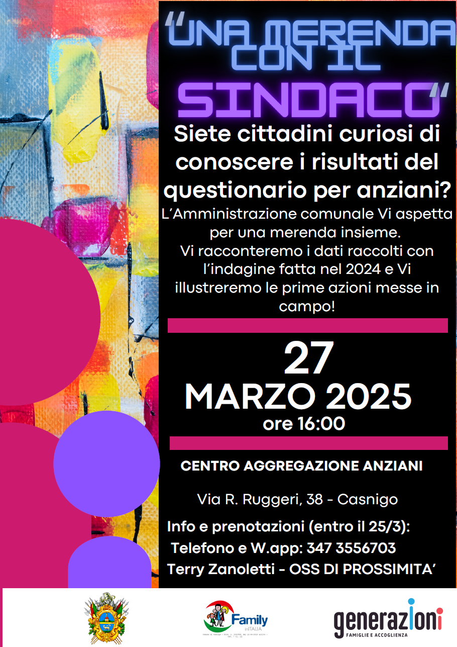 I cittadini curiosi di conoscere i risultati del questionario rivolto agli anziani sono invitati a partecipare a un incontro conviviale organizzato dall'Amministrazione comunale. Durante questo incontro, verranno presentati i dati raccolti nell’indagine svolta nel 2024, che ha coinvolto numerosi anziani della comunità, e saranno illustrate le prime iniziative che sono state adottate in risposta alle esigenze emerse. L'incontro rappresenta un'importante occasione di condivisione e confronto, in cui sarà possibile discutere insieme le possibili evoluzioni future per migliorare la qualità della vita degli anziani sul nostro territorio.