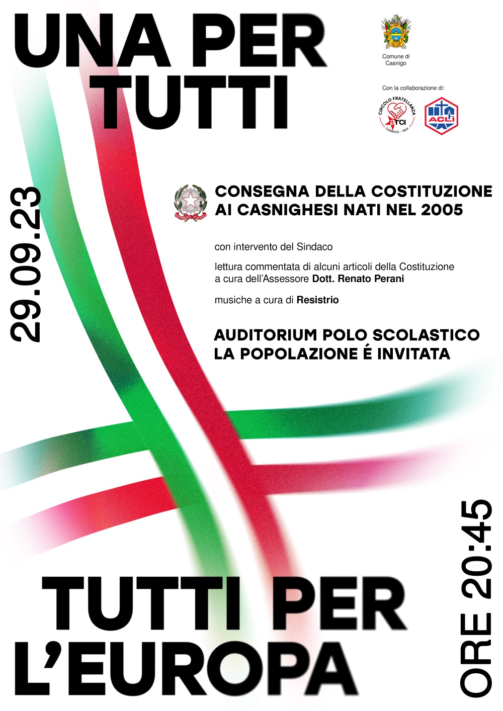 Un momento fondamentale per i casnighesi nati nel 2005, in quanto ci sarà la consegna della Costituzione e una lettura commentata di alcuni Articoli.