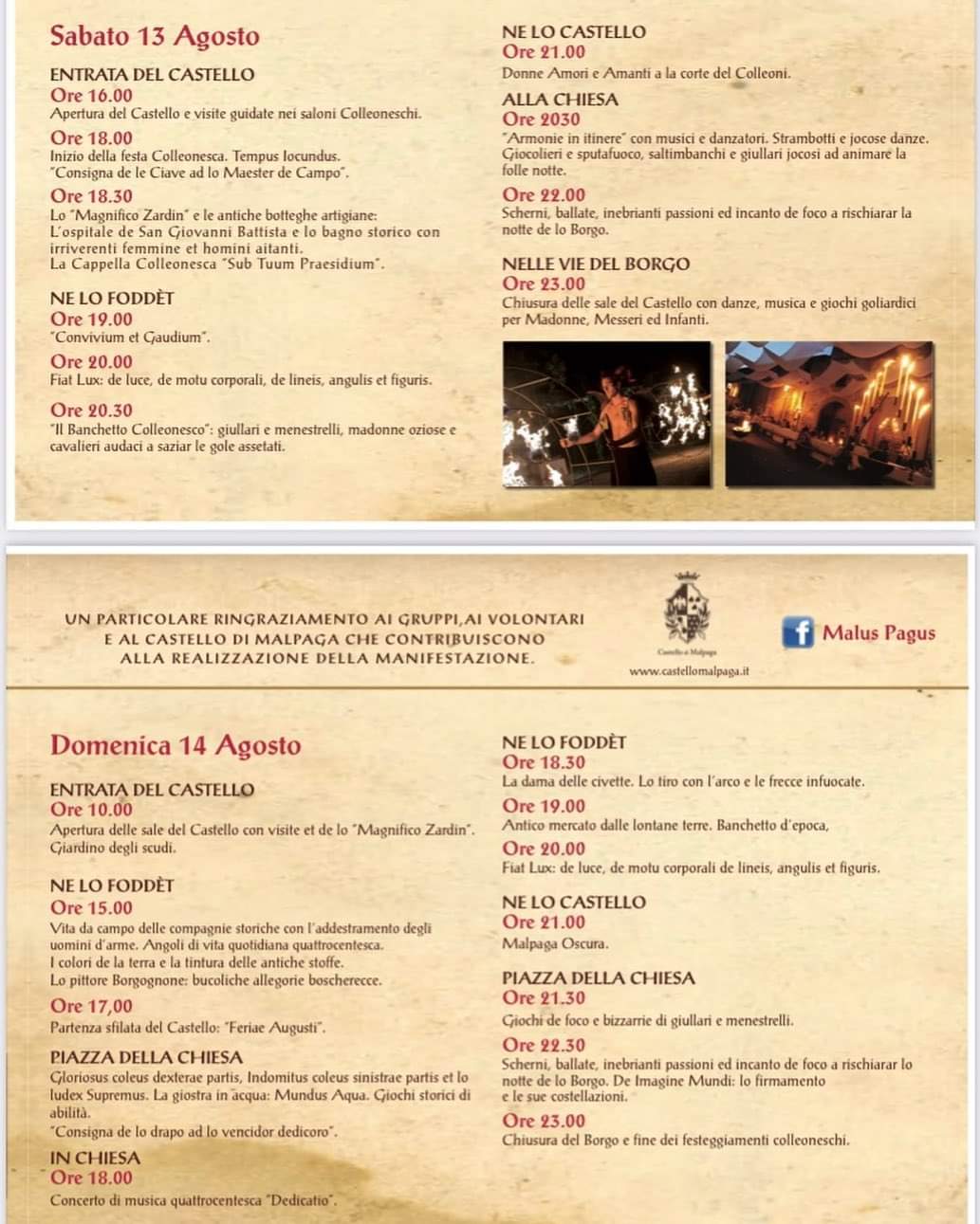dalle 21:00 alle 24:00 visite notturne: "Donne, amori e amanti; il castello di Malpaga", alla flebile luce di lanterne e candele, vi invita alla scoperta dell’amore tra luci e ombre, relazioni proibite, amori perduti di fantasmi che non trovano pace, terribili punizioni, l’ideale poetico-carnale dell’Amor Cortese, prostituzione, erotismo, pozioni d’amore e curiosità legate al mondo amoroso delle corti, con uno sguardo inedito sulle nuove ricerche storiche condotte a Malpaga. Tre turni di visita, dalle 21.00 alle 22.15, dalle 21.30 alle 22.45, dalle 22.30 alle 23.45. Prenotazione obbligatoria, mostra sconsigliata ai minori di 12 anni.