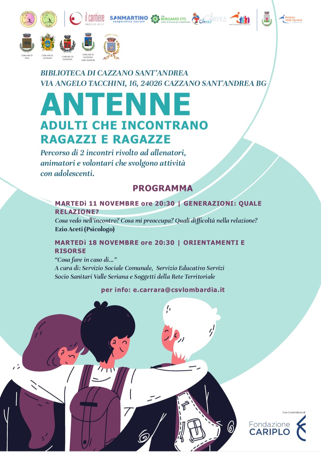 Il primo dei due incontri di «Antenne. Adulti che incontrano ragazzi e ragazze». Un’occasione per riflettere insieme sulle sfide educative, comprendere meglio i bisogni dei ragazzi e trovare nuovi strumenti per accompagnarli nella crescita. Lo psicologo Ezio Aceti stimolerà il dialogo: cosa vedo nell'incontro? Cosa mi preoccupa? Quali difficoltà nella relazione?