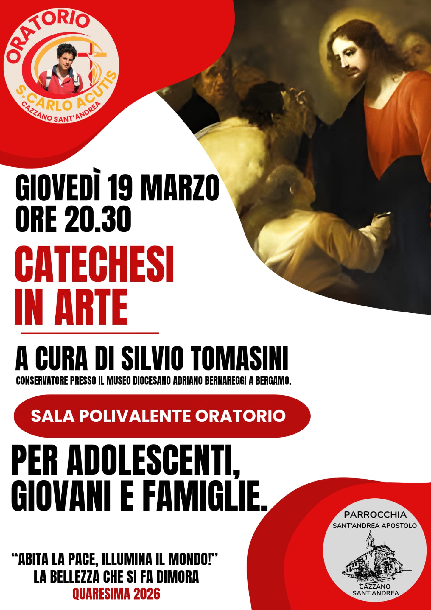 Giovedรฌ 19 marzo alle 20.30, presso la sala polivalente dellโOratorio di Cazzano SantโAndrea, si terrร un incontro di catechesi attraverso lโarte, rivolto ad adolescenti, giovani e famiglie. Un appuntamento pensato per scoprire come la bellezza artistica possa diventare via di riflessione, preghiera e approfondimento del messaggio cristiano.