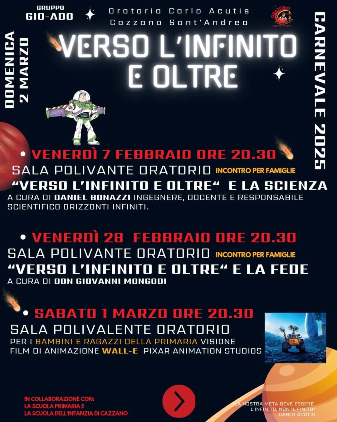 Abbiamo organizzato alcuni incontri speciali per approfondire il tema del Carnevale 2025 e riflettere insieme sull'infinito, tra curiosità, scoperte e riflessioni. Unisciti a noi per un’esperienza che va oltre il semplice divertimento!