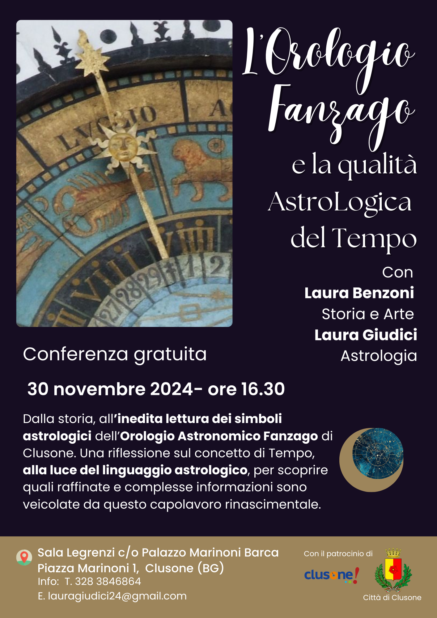 Il 30 novembre, con la guida Laura Benzoni e l'astrologa Laura Giudici, si terrà una conferenza gratuita dedicata alle informazioni astrologiche contenute nell’orologio Fanzago di Clusone, proposta per celebrare i 440 anni di vita dell’orologio.