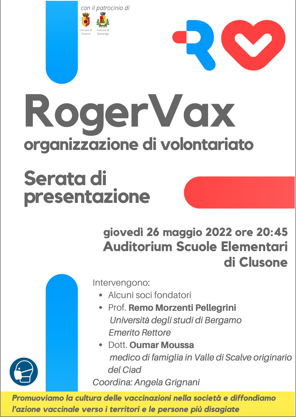 Presso l'auditorium delle scuole elementari di Clusone, giovedì 26 maggio si terrà la presentazione di Roger Vax. Nata a febbraio 2022, è un'organizzazione di volontariato il cui intento è la promozione della cultura delle vaccinazioni nella società odierna e verso i territori più disagiati. Parteciperanno il Prof. Remo Morzenti Pellegrini, Emerito Rettore, e il Dott. Oumar Moussa. Per ulteriori informazioni, scaricare e consultare la locandina in allegato. Partecipazione gratuita.
