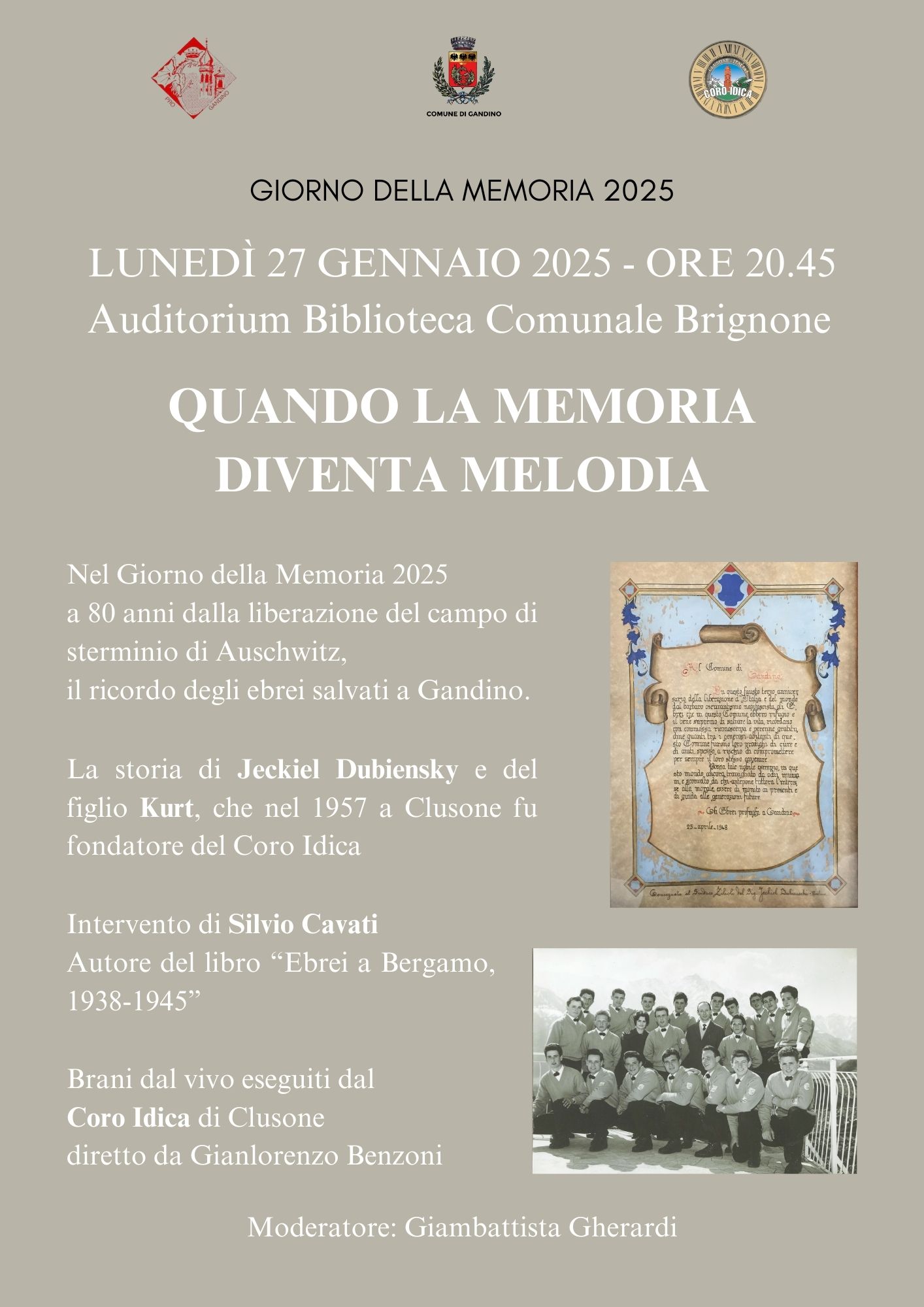 Nel giorno della memoria, il ricordo degli Ebrei, in particolare la storia di Jeckiel Dubiensky e del figlio Kurt, che nel 1957 a Clusone, fu fondatore del Coro Idica. Modera la serata Giambattista Gherardi.