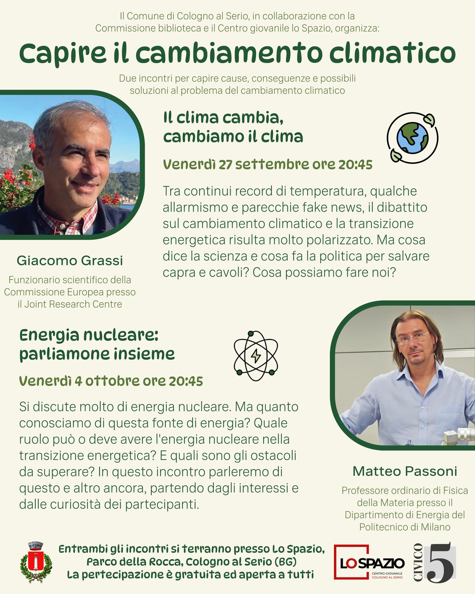 La Commissione biblioteca di Cologno al Serio organizza una serie di incontri invitando figure tra le più importanti in Italia (e non solo) che possono parlare di cambiamenti climatici e di alcune delle possibili soluzioni energetiche senza sconfinare nel banale, ma partendo da solide e appurate basi scientifiche convalidate da dati.