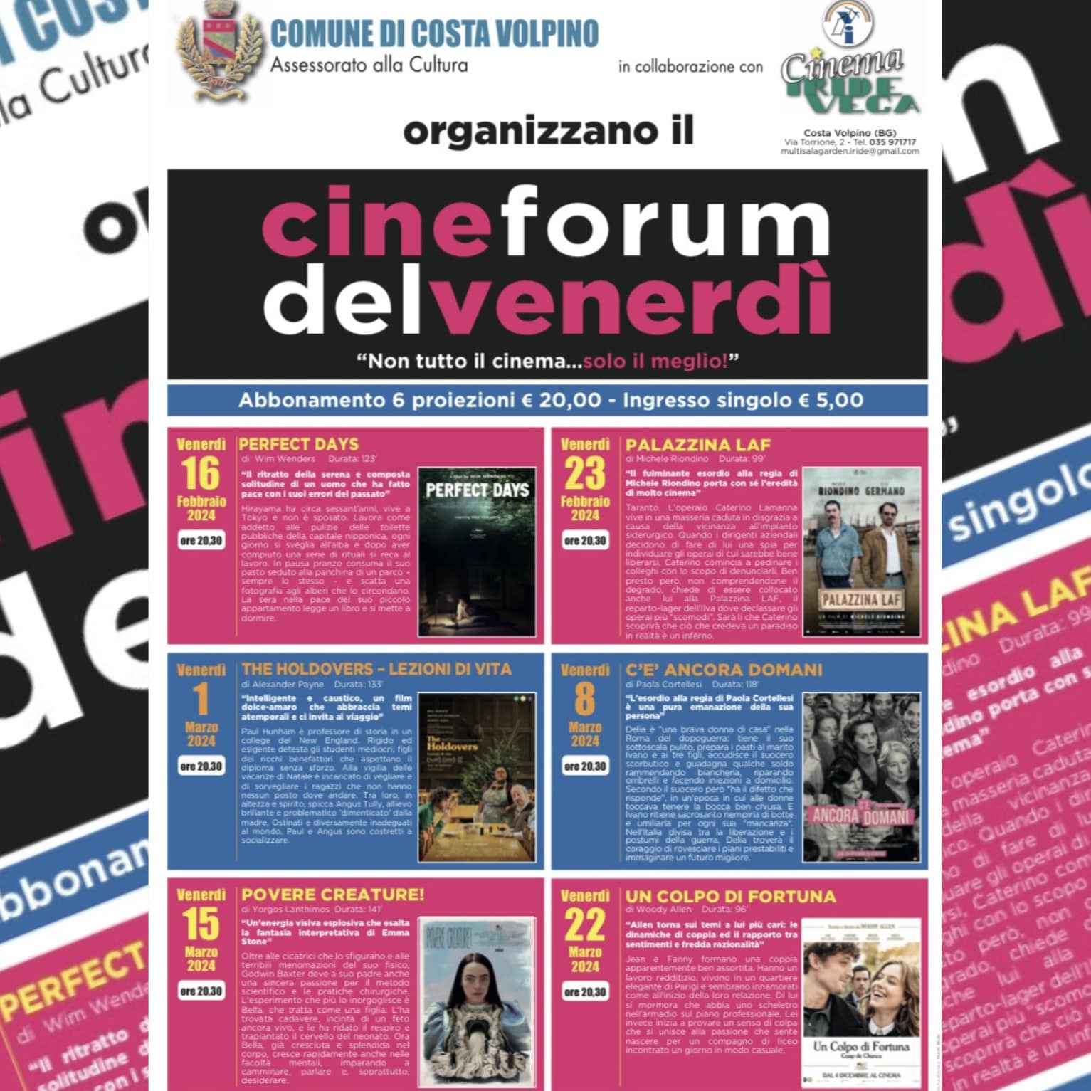 L'Assessorato alla Cultura del Comune di Costa Volpino, in collaborazione con il Cinema Iride Vega, organizza la rassegna “Cineforum del venerdì”.