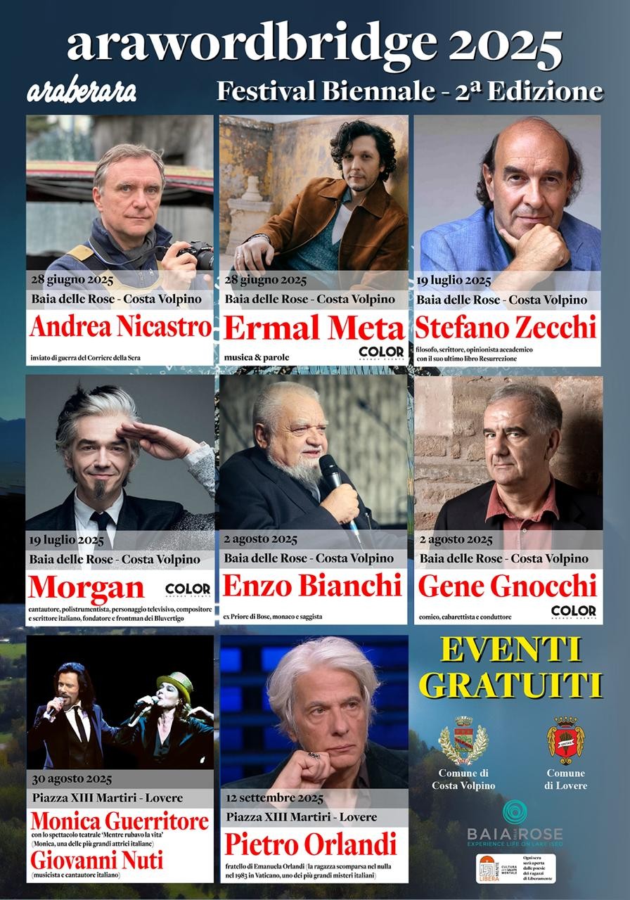 Torna la seconda edizione del festival biennale ‘Arawordbridge’ organizzato dal periodico Araberara. Cinque appuntamenti, cinque serate di musica, teatro, giornalismo tra la "Baia delle Rose" a Costa Volpino e la piazza XIII Martiri di Lovere, location suggestive in riva al Lago d’Iseo. Tutti gli eventi saranno gratuiti (a partire dalle 20.45) Il festival "Arawordbridge" è nato due anni fa in occasione di Bergamo e Brescia capitale della cultura, ma stavolta coprirà tutta l’estate, partendo il 28 giugno per concludersi il 12 settembre. Arawordbridge un ponte che ancora una volta unisce e non divide, i confini che fanno da unione e non da divisione. Un festival per tutti, dagli amanti del teatro o della letteratura, della musica o della religione e della comicità. Un festival per ogni età. Per ogni gusto. Per ogni persona. Per ogni lettore o non lettore. Per ogni sognatore o non sognatore. Insomma, un festival per la gente e della gente. Il nostro Festival abbina sempre progetti sociali. Quest’anno il tema è la salute mentale, e così abbiamo pensato all’attrice Monica Guerritore che interpreta Alda Merini in uno spettacolo mai prima d’ora rappresentato in una piazza. L’anteprima di ogni evento sarà curata dai ragazzi di "LiberaMente", associazione di volontariato che si occupa di recuperare e affiancare ragazzi e ragazze che soffrono di malattie mentali. I ragazzi, seguiti da esperti del settore, hanno scritto poesie che reciteranno le sere del festival e che sono diventate un libro ‘Perché fare poesia? Un destino per l’uomo’.