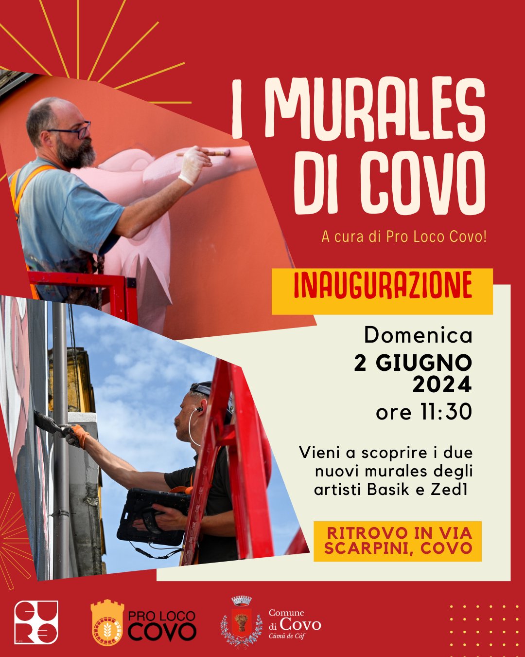 La città di Covo è lieta di invitarvi a un evento speciale per celebrare la bellezza e l'arte nella nostra comunità! Venite a scoprire i due nuovi murales realizzati nelle ultime settimane dai talentuosi artisti Zedone e Basik. Queste opere d'arte straordinarie arricchiscono il nostro paese e rappresentano un'importante aggiunta al nostro patrimonio culturale.