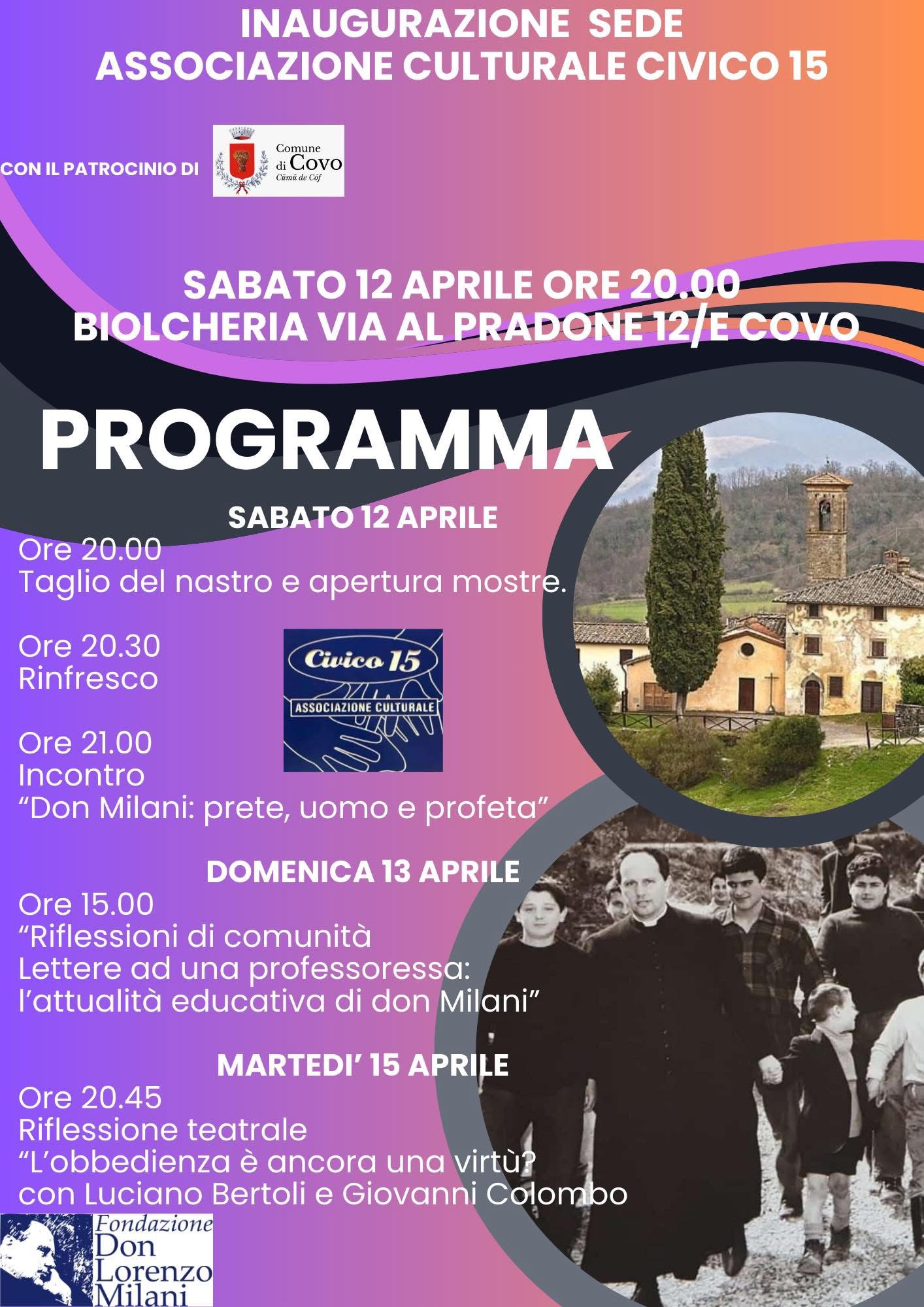 L'Associazione Culturale Civico 15 organizza l'inaugurazione della sua nuova sede, un evento che segna l'inizio di una nuova stagione di attività culturali e sociali. L'inaugurazione si terrà sabato 12 aprile presso Biolcheria, situata in Via al Pradone 12/E, Covo, e sarà un'occasione per scoprire il programma di eventi e iniziative che l'associazione ha in serbo per il futuro.