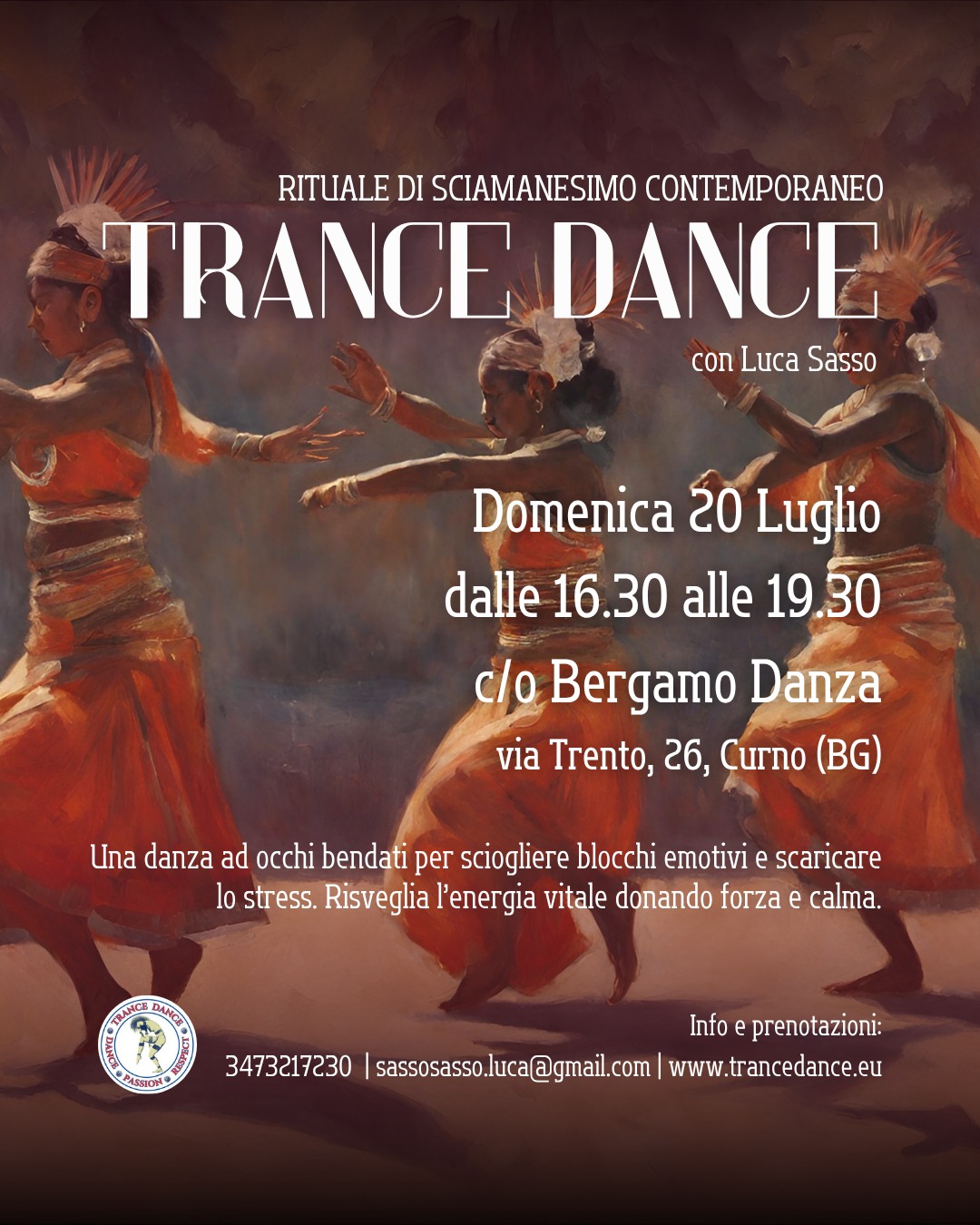 La Trance Dance è un rituale di danza da praticare bendati che permette di risvegliare vitalità e passione. Il corpo si libera da stress, tensioni, tossine, blocchi emotivi, insicurezze, traumi e vecchie ferite donando presenza forza e calma. Muovendoti rapidamente al ritmo delle percussioni scivolerai naturalmente in uno stato di coscienza estatico. Per i nostri antenati fu uno strumento di trasformazione e di apertura al proprio mondo interiore.