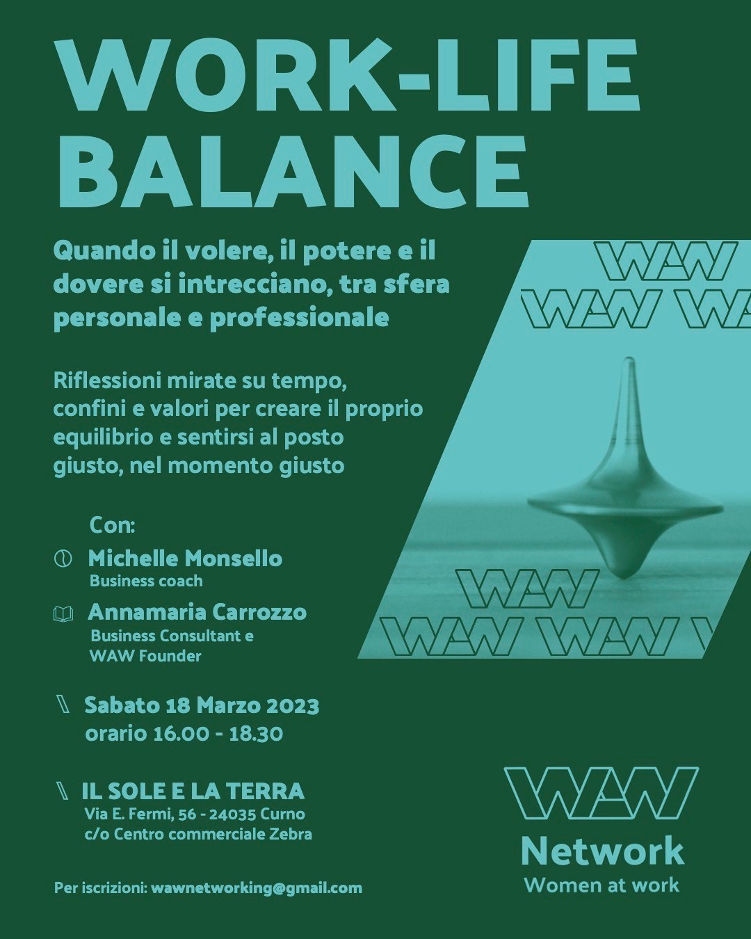 Guidati da Michelle Monsello - Business coach e Annamaria Carrozzo - Business Consultant e WAW Founder, condivideremo riflessioni su tempo, confini e valori per creare il proprio equilibrio e sentirsi al posto giusto, nel momento giusto. Partecipazione: gratuita per i nuovi partecipanti. Ci sarà l'opportunità di aderire a tutto il calendario dell’associazione o ai singoli eventi.