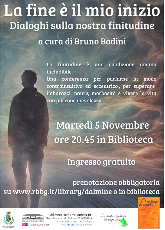 Prosegue la rassegna culturale "C'è un tempo da scoprire" della città di Dalmine: appuntamento con una serata dedicata ai dialoghi sulla finitudine, condizione umana, a cura di Bruno Bodini.