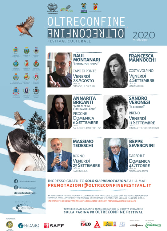 Nonostante la rassegna avrà inevitabilmente una veste ridotta, con questa edizione straordinaria OltreConfine Festival vuole dare al territorio un forte segnale di presenza e di resistenza del mondo culturale, con la proposta di sei appuntamenti locati in sei comuni diversi della Valle Camonica. È possibile partecipare agli eventi solo prenotando via mail.