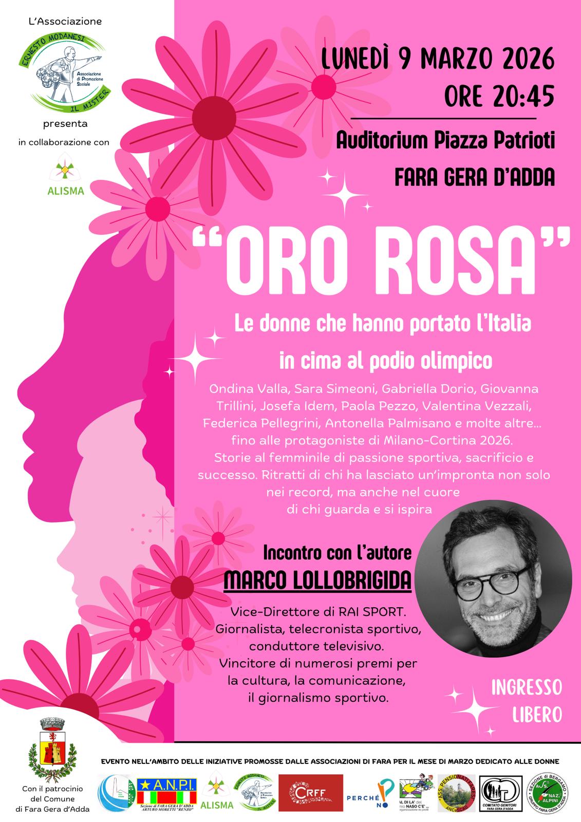 L'Auditorium Piazza Patrioti di Fara Gera d'Adda ospita il neo direttore di Rai Sport, Marco Lollobrigida, per raccontare le imprese olimpiche delle atlete italiane che hanno portato l'Italia in cima al medagliere.