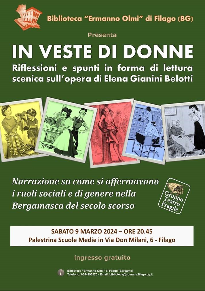 Riflessioni e spunti in forma di lettura scenica sull'opera di Elena Gianini Belotti. Narrazione su come si affermavano i ruoli sociali e di genere nella bergamasca del secolo scorso.