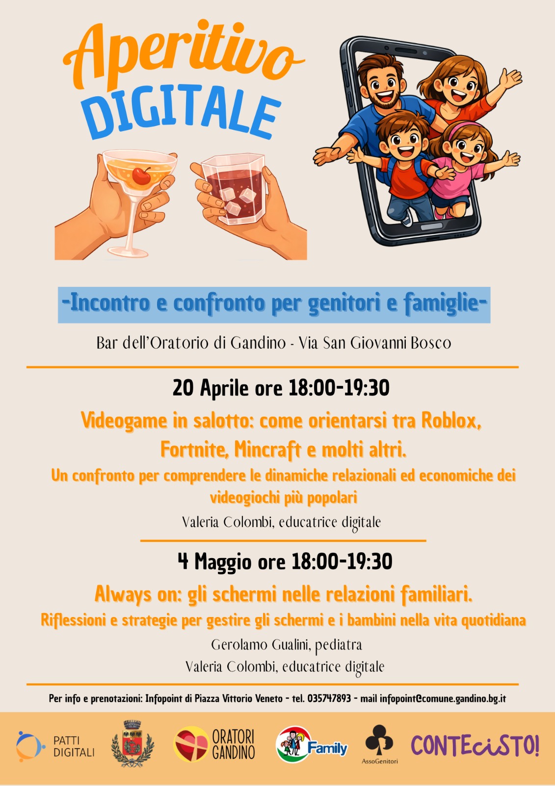 Unโoccasione di confronto e dialogo dedicata a genitori e famiglie per approfondire il rapporto tra bambini, ragazzi e tecnologie digitali. Gli incontri si terranno presso il Bar dellโOratorio di Gandino e offriranno strumenti utili per orientarsi tra videogiochi, schermi e nuove dinamiche relazionali.