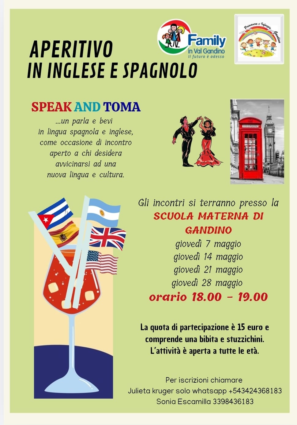 Unโoccasione informale e aperta a tutte le etร per avvicinarsi allโinglese e allo spagnolo attraverso il dialogo, lโascolto e il piacere di stare insieme.