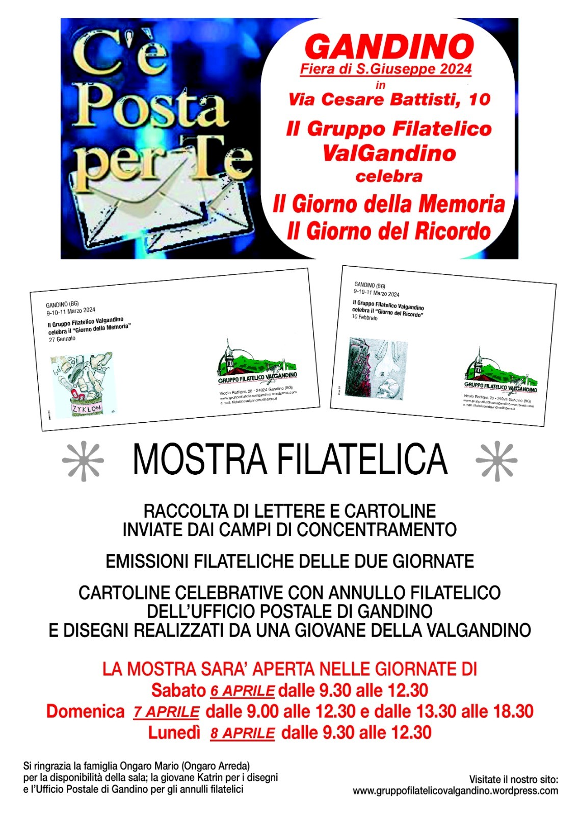 Il Gruppo Filatelico Val Gandino organizza dal 6 all'8 aprile “C’è Posta per Te”, mostra filatelica destinata a celebrare attraverso le emissioni dedicate il “Giorno della Memoria” ed il “Giorno del Ricordo”. L’esposizione, allestita negli spazi di via Cesare Battisti, 10 messi a disposizione dalla famiglia Ongaro Mario, proporrà innanzitutto una raccolta di lettere e cartoline inviate dai campi di concentramento. Ad essa si aggiungono le emissioni filateliche dedicate alle due giornate, le cartoline celebrative con annullo filatelico dell’Ufficio Postale di Gandino (fra i cinque Sportelli della provincia di Bergamo insieme a Bergamo centro, Lovere, Treviglio e Zogno), i disegni di Katrin, giovane gandinese.