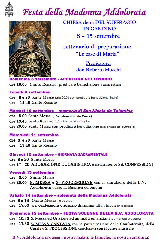 Come ogni anno si celebra la terza domenica di settembre la Festa della Madonna Addolorata, con la processione durante la quale si porta la statua dell’Addolorata. Sarà presente la confraternita del Suffragio, attiva presso la chiesa omonima dal 1767. I confratelli per essere messi a parte delle indulgenze di cui godevano le altre confraternite, dovettero erigere l’altare dedicato alla Madonna Addolorata, svolgere la processione ogni anno e come singoli fedeli recitare il Rosario.