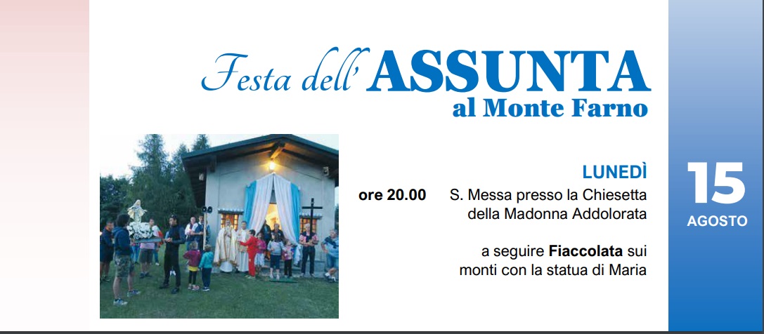 Si svolgerà lunedì 15 agosto 2022, nella consueta, suggestiva cornice dei pascoli del Monte Farno la tradizionale festa dell’Assunta, che fa capo alla chiesetta seguita dalla parrocchia di Barzizza.