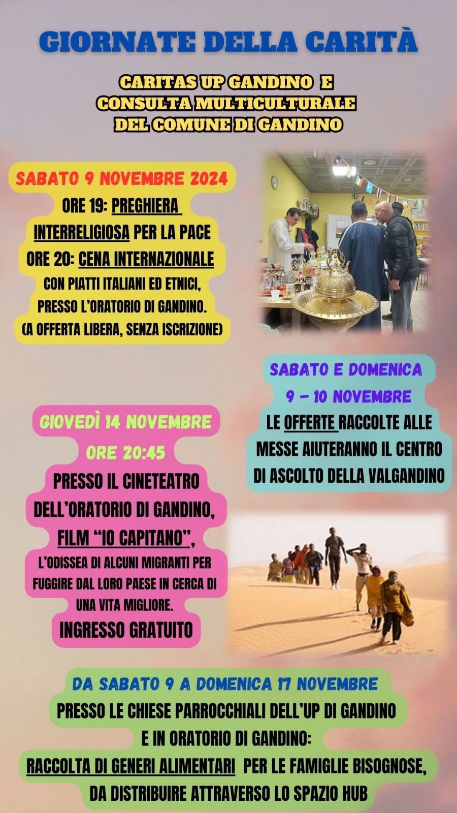 La Caritas UP Gandino e la Consulta Multiculturale del Comune di Gandino invitano a partecipare alle Giornate della Carità, un’occasione speciale per stare insieme e condividere momenti di solidarietà e cultura.