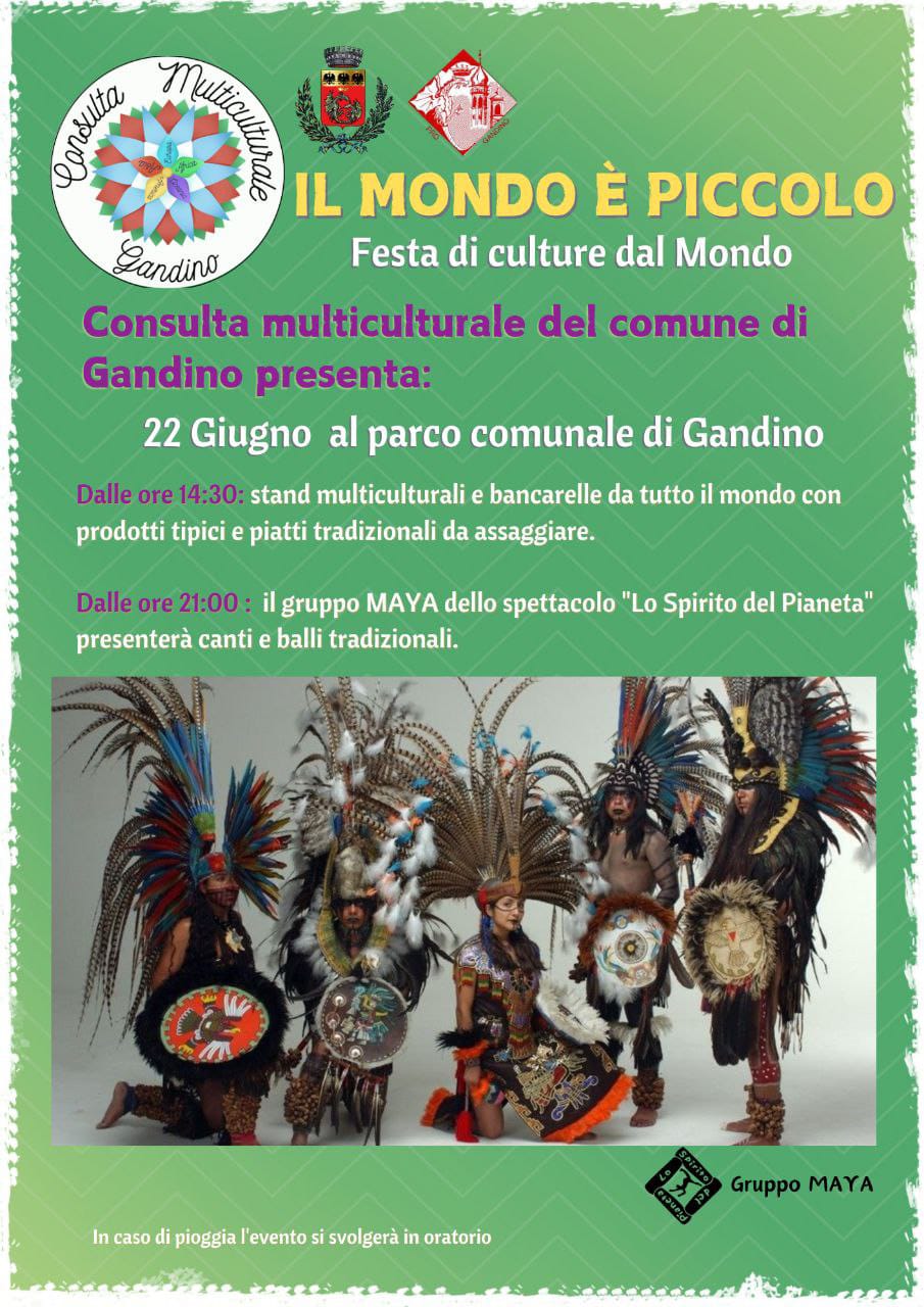 Un pomeriggio dedicato alla multiculturalità e alle specialità gastronomiche di ogni angolo del mondo ed uno spettacolo serale all’insegna dell’antica cultura Maya. La Consulta Multiculturale del Comune di Gandino organizza sabato 22 giugno l’iniziativa “Il Mondo è piccolo - Festa di culture dal Mondo”, che porterà in paese i temi che decretano da anni il successo de “Lo Spirito del Pianeta” attualmente in corso a Clusone.