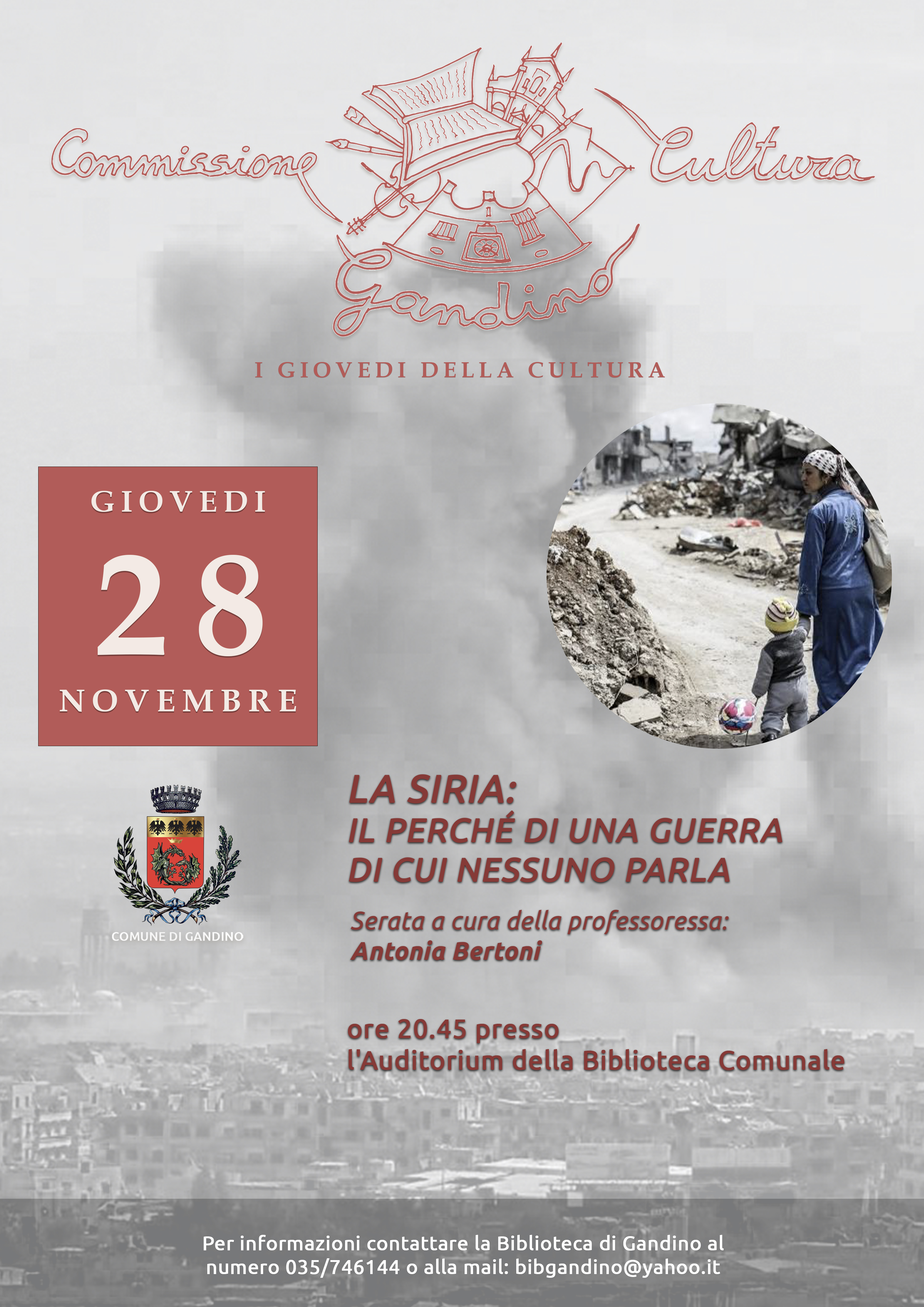 La Commissione Cultura di Gandino presenta un nuovo appuntamento de "I Giovedì della Cultura". Invito a una serata di approfondimento sulla complessa situazione in Siria, un conflitto di cui spesso si parla troppo poco.