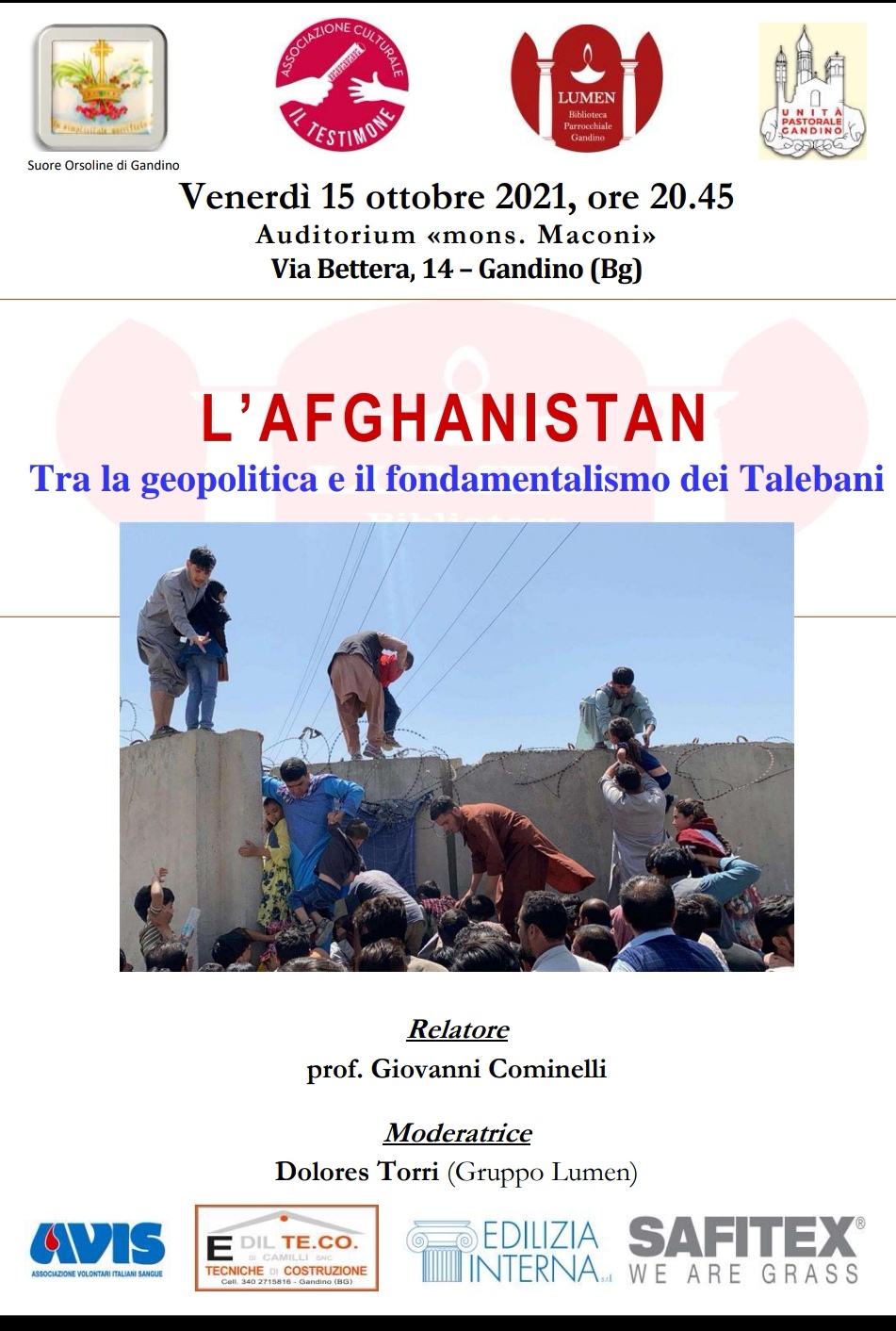 Un serata di approfondimento, legata ad un tema di stretta attualità che interroga ciascuno di noi. E’ in programma venerdì 15 ottobre a Gandino la conferenza sul tema “L’Afghanistan, tra la geopolitica e il fondamentalismo dei Talebani”. L’incontro, organizzato dal Gruppo Lumen, si terrà nell’auditorium mons. Maconi del Centro Pastorale di via Bettera, a pochi passi dalla Basilica. Sarà guidato dal prof. Giovanni Cominelli, con moderatrice Dolores Torri. La serata è patrocinata dall’Unità Pastorale di Gandino, Barzizza e Cirano, dall’Associazione Culturale “Il Testimone” e dall’Istituto delle Suore Orsoline di Gandino. L’iniziativa rientra nel più ampio contesto della promozione culturale che il Gruppo Lumen, coordinato dal prof. Pietro Gelmi, porta avanti dal 2017 nell’ambito delle attività della Biblioteca Parrocchiale “mons. Francesco Caccia” di Gandino. Il gruppo è aperto a tutti quanti condividano le preoccupazioni e l’attenzione per i cambiamenti epocali che viviamo e vogliano partecipare alla riflessione comune sui temi del tempo storico presente. “Siamo convinti – spiegano i promotori - che sia possibile un mondo migliore, solo se ciascuno di noi si assume le responsabilità che gli competono in quanto persona e in quanto cittadino. Siamo impegnati a stimolare l’assunzione di responsabilità delle persone in due ambiti: quello della conoscenza del mondo presente e quello dell’educazione delle giovani generazioni”.
