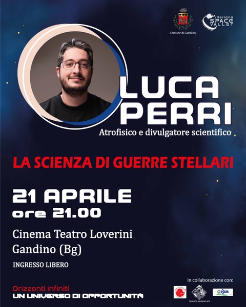 A Gandino prosegue il mese di esplorazione spaziale. Grazie al coordinamento organizzativo del Comune di Gandino e Seriana Space Valley , sono in programma quattro serate con relatori davvero…spaziali. In quest'occasione, incontro con Luca Perri.